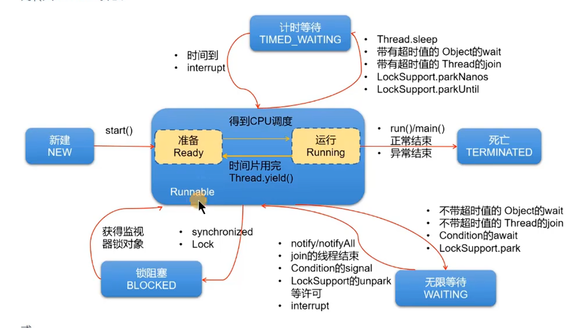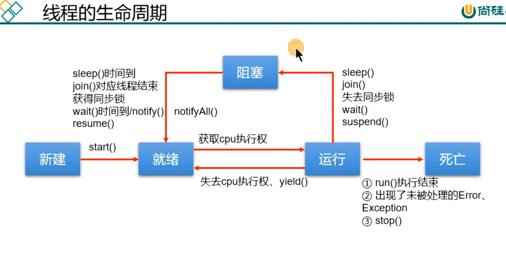 - 每个线程都是通过某个特定Thread对象的run()方法来完成操作的,因此把run()方法体称为