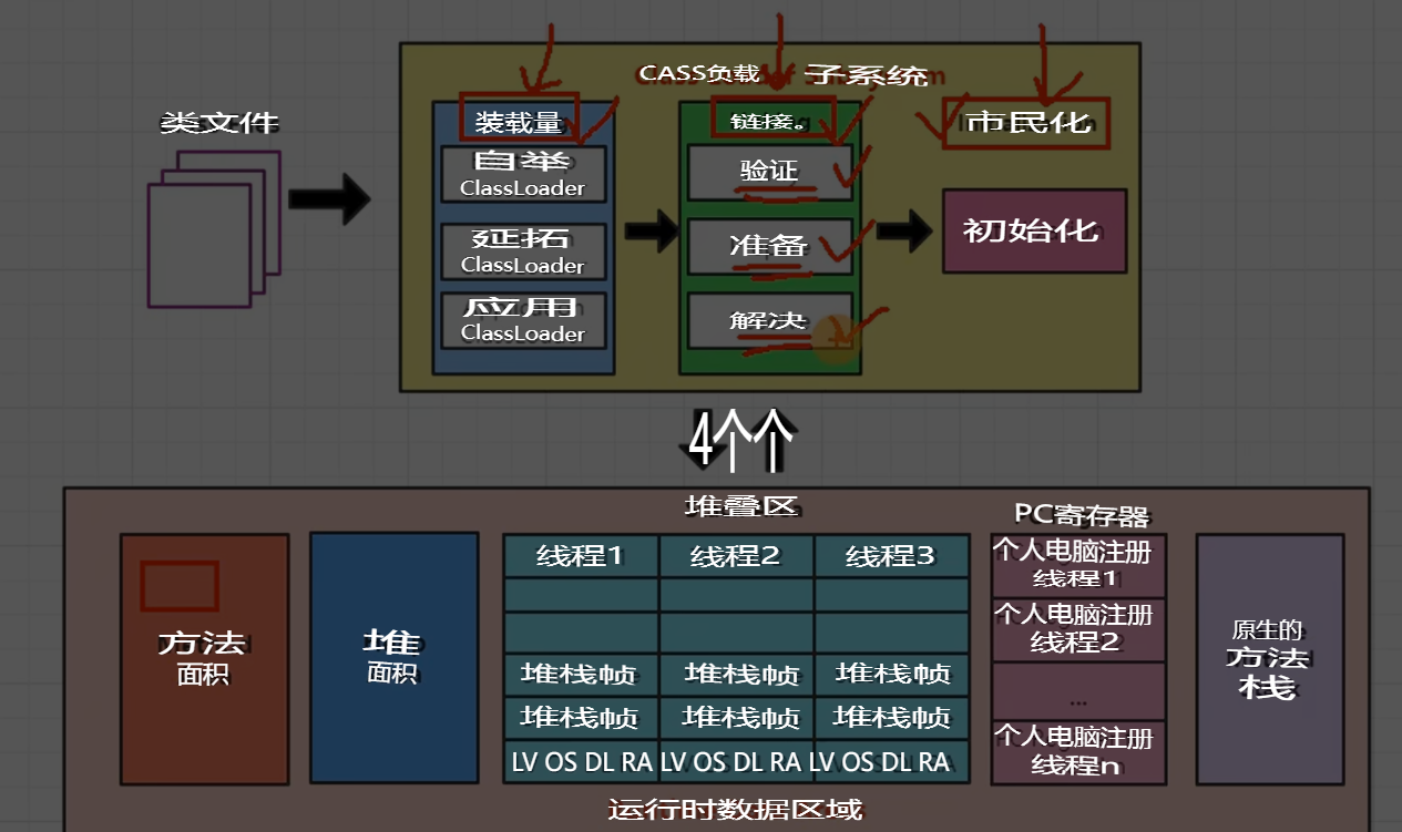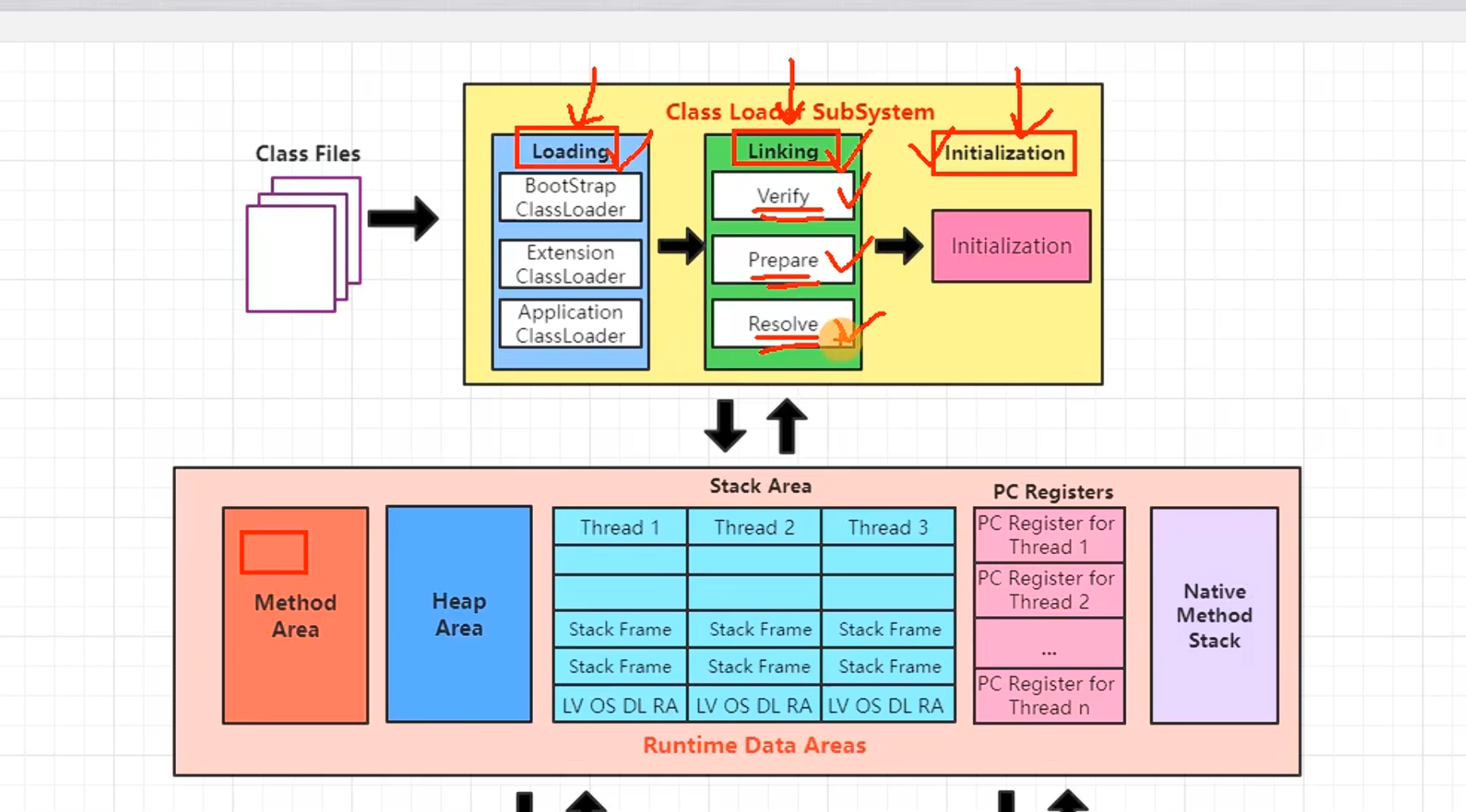 - 方法区:加载的类会放在方法区中,方法区是JVM内存的一部分,用于存储类的元数据、常量、静态变量等
