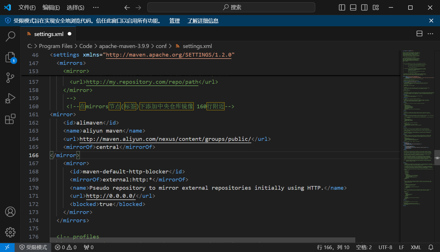 <!-- 在 mirrors 节点下添加中央仓库镜像(160 行附近) -->