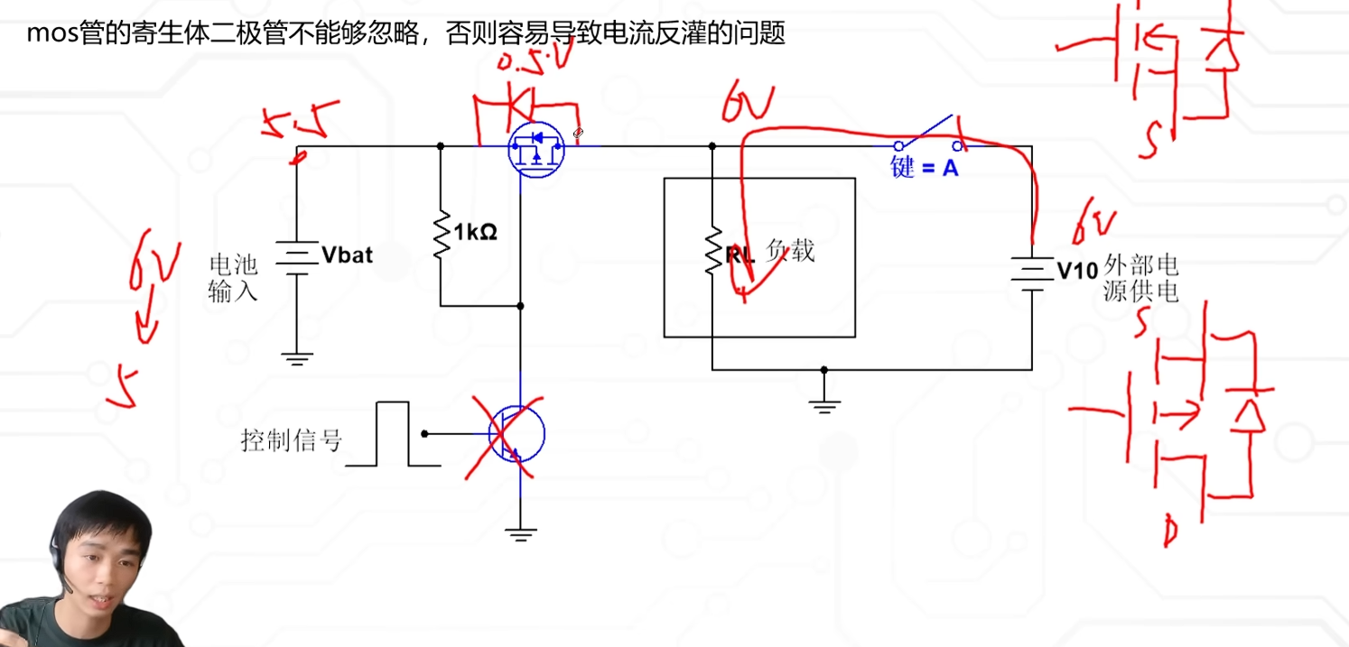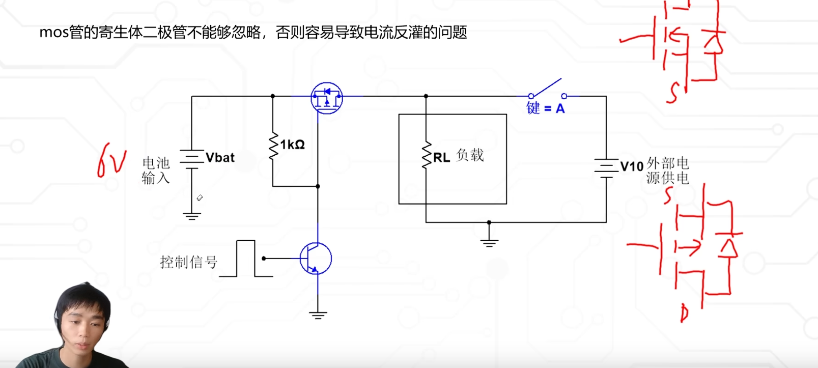 在这个电路中,电流可能会通过寄生二极管给电池充电