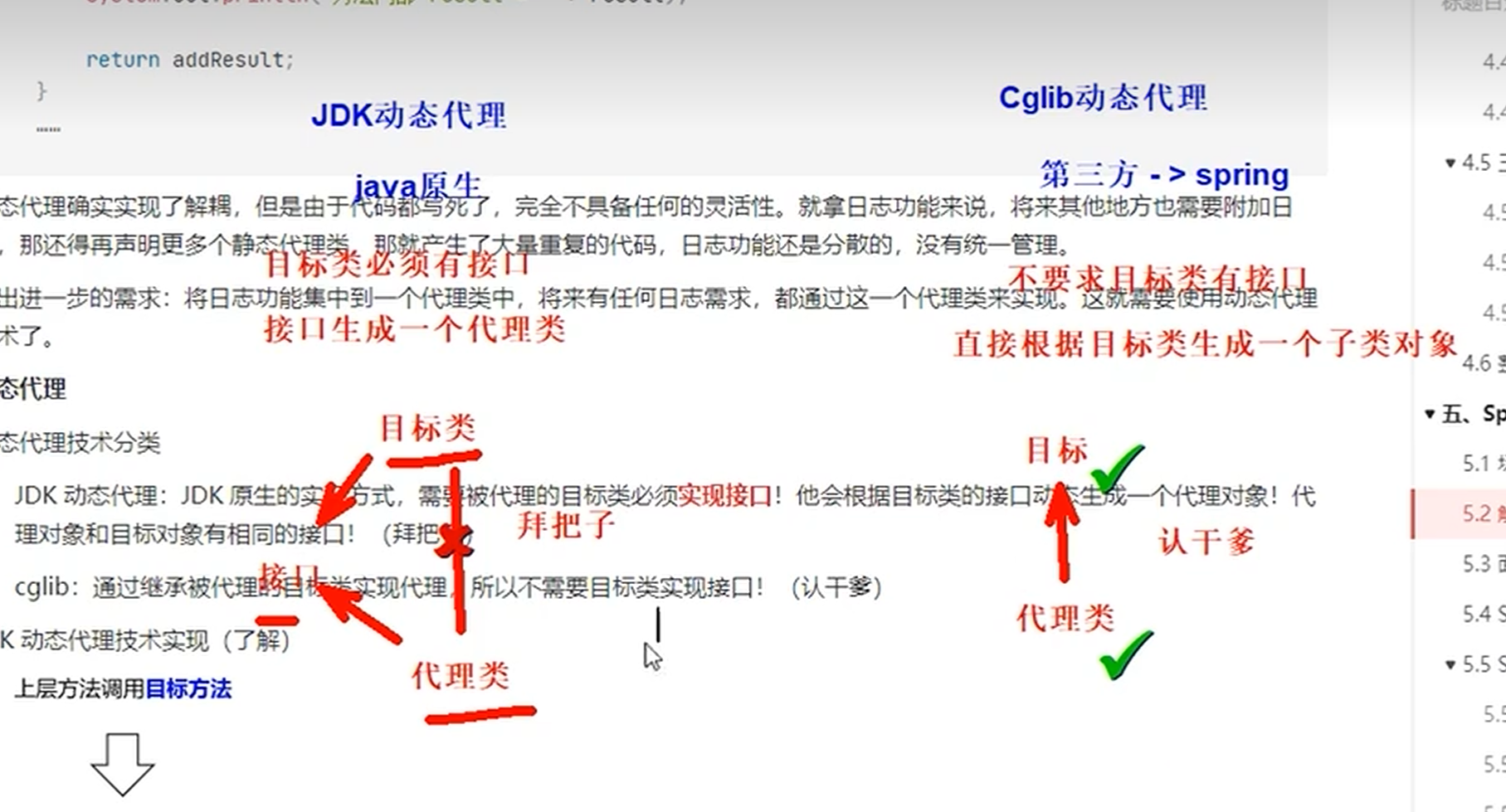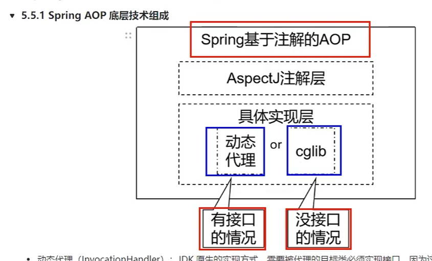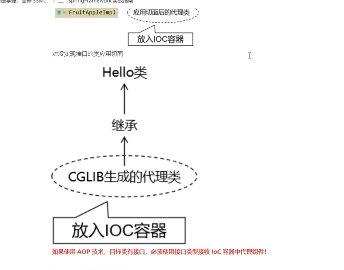 - 当你使用Spring AOP时,Spring容器会为被代理的bean创建一个代理对象。这个代理对象可能是JDK动态代理对象(如果目标对象实现了接口),或者是CGLIB代理对象(如果目标对象没有实现接口)。
