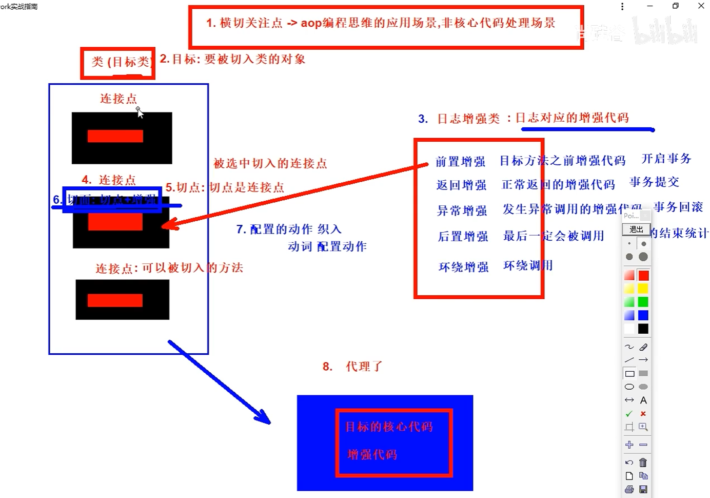 - 通知(Advice):通知是切面在连接点上执行的代码。通知有多种类型,如前置通知、后置通知、环绕通知等。