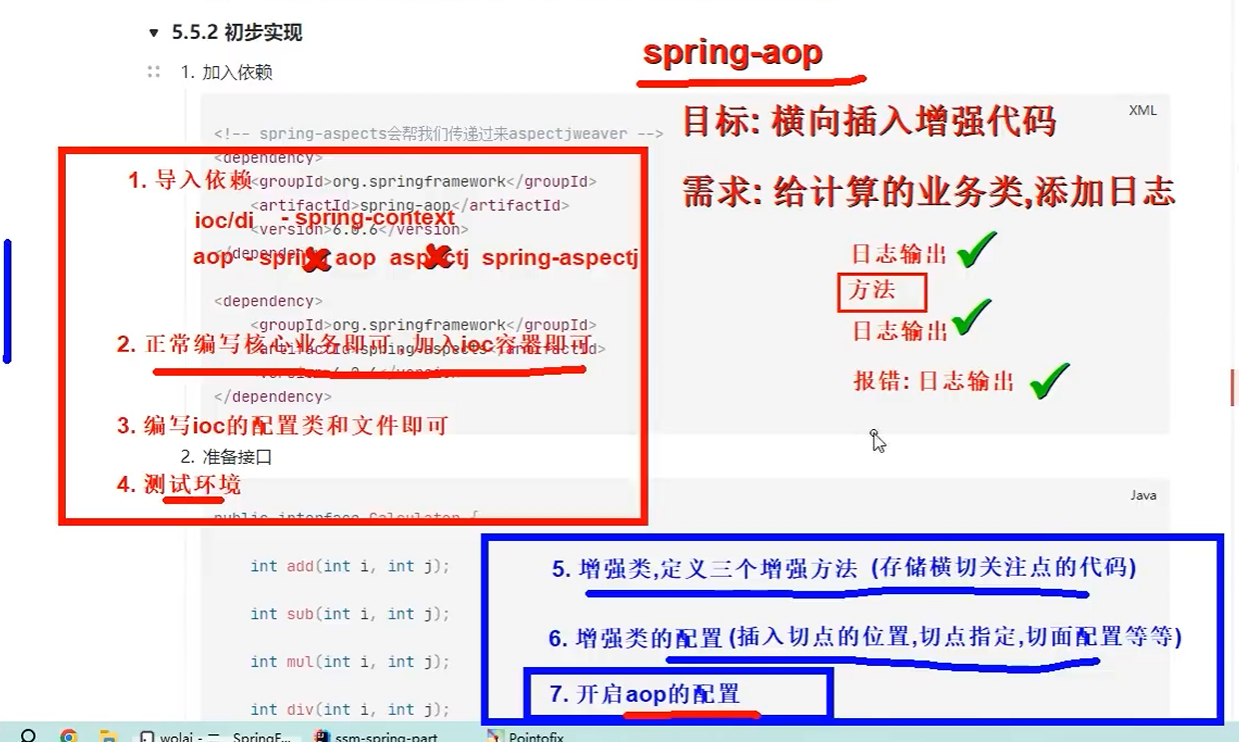 pom.xml中添加Spring框架和AOP相关的依赖,如spring-context和aspectjweaver。 - 定义业务接口和实现类:创建业务逻辑接口及其实现,例如一个服务类