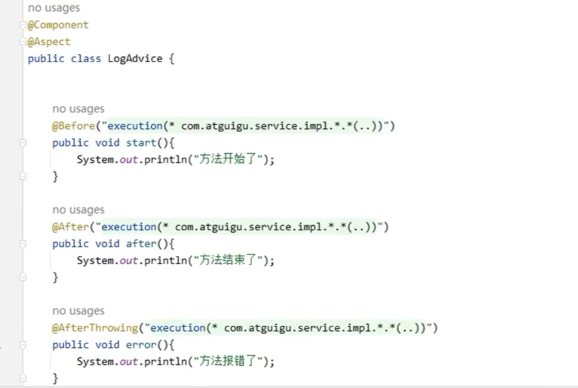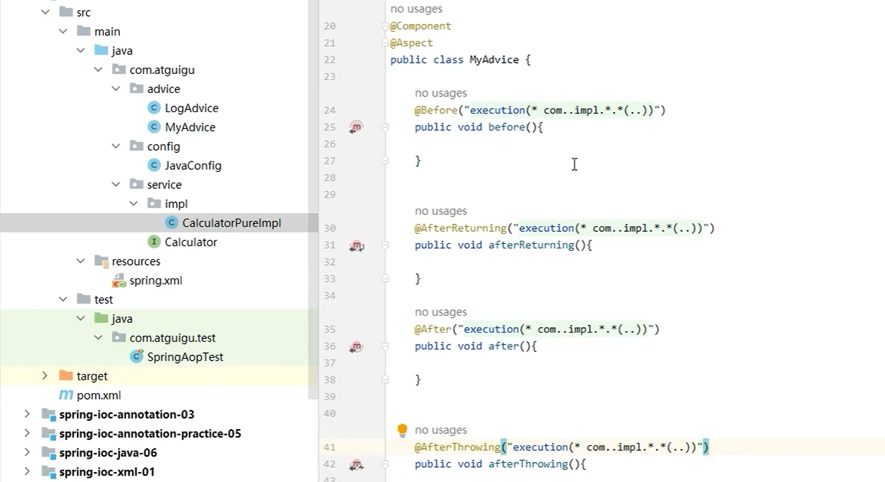 MyService和它的实现MyServiceImpl。 - 定义切面类:创建一个切面类,用于定义前置、后置、环绕等通知。例如,
