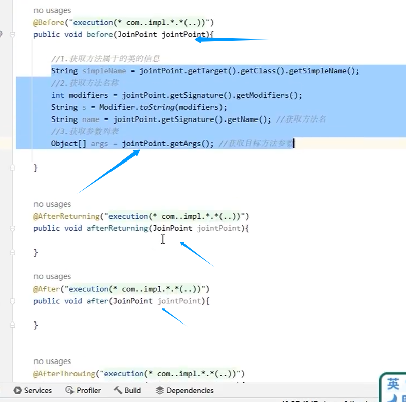 添加JoinPoint即连接点即可获取目标方法的信息