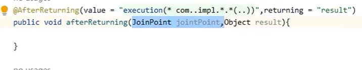 @AfterReturing(value = "execution(* com.impl..((..))",returing = "形参")