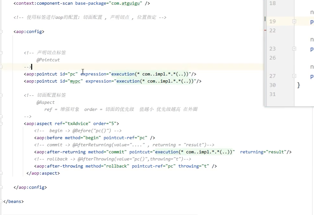 </aop:config>- **配置通知**:在`<aop:aspect>`标签内部使用对应的标签配置通知的类型,并建立通知方法和切入点方法的关联。